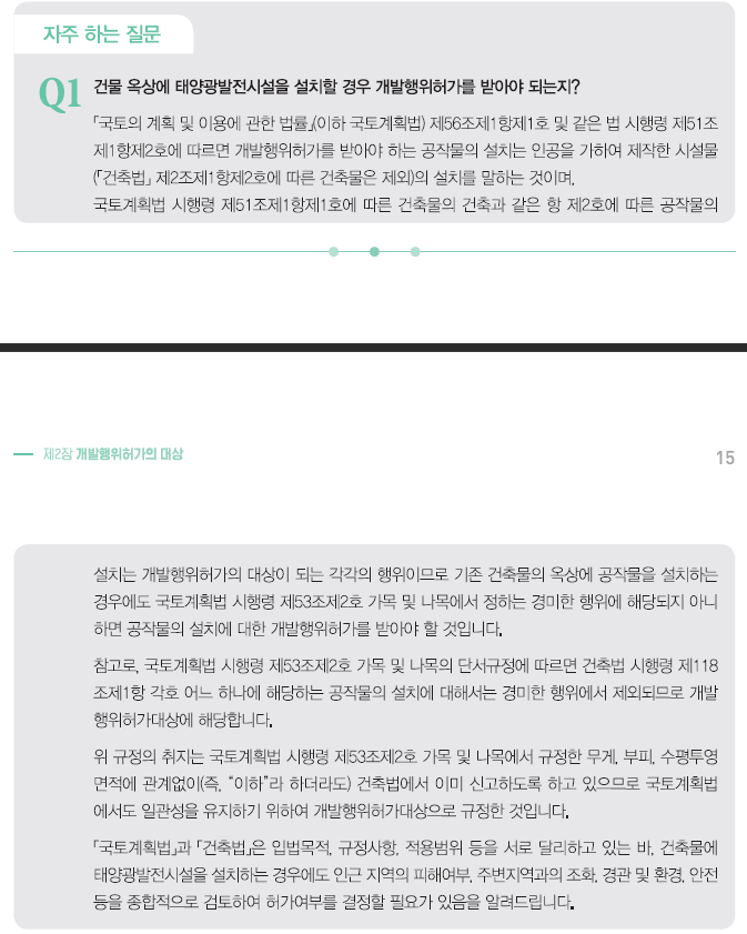 다시 말해서, 건축물 옥상 등에 설치하는 태양광발전시설에 대한 국토교통부 지침은 태양광 발전설비를 건축물의 부속설비로 간주해서 면적, 높이, 안전 등의 기준을 검토하도록 하고 건축법 상 공작물축조신고 절차를 밟지 않아도 된다는 취지이지 국토계획법 상 개발행위허가를 배제하라는 내용은 아님을 주의해야 한다.