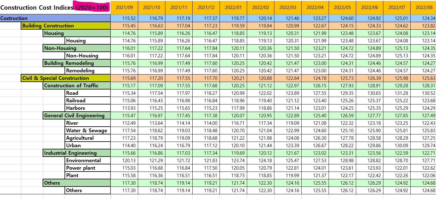 1. 건설공사비지수 : 건설공사비지수(Construction Cost Index)는 건설공사에 투입되는 직접공사비를 대상으로 특정시점(생산자 물가지수 2020년)의 물가를 100으로 하여 재료, 노무, 장비 등 세부 투입자원에 대한 물가변동을 추정하기 위해 작성된 가공통계 자료