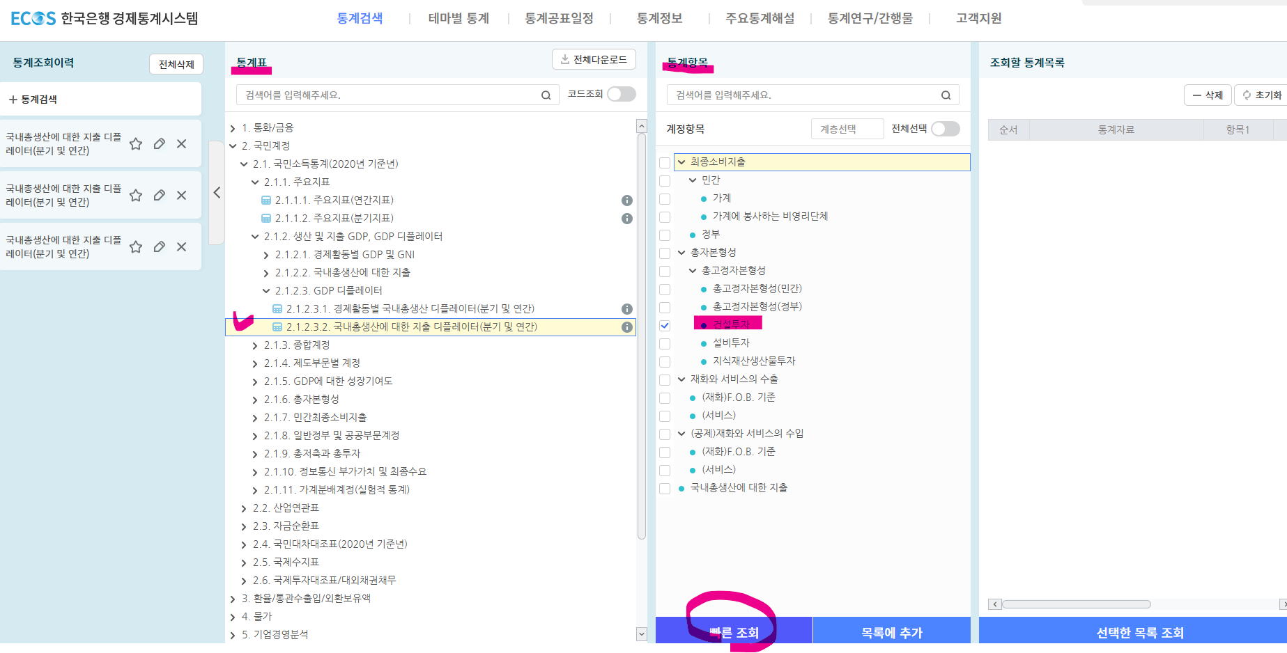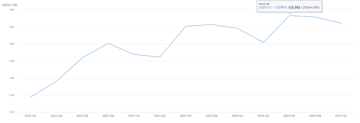 >> 한국은행경제통계시스템 홈페이지>> 메인화면에서 GDP 클릭 >> 통계표에서 2.1.2.3.2. 클릭 >> 통계항목에서 '건설투자' 선택 후 '빠른 조회' 버튼 클릭