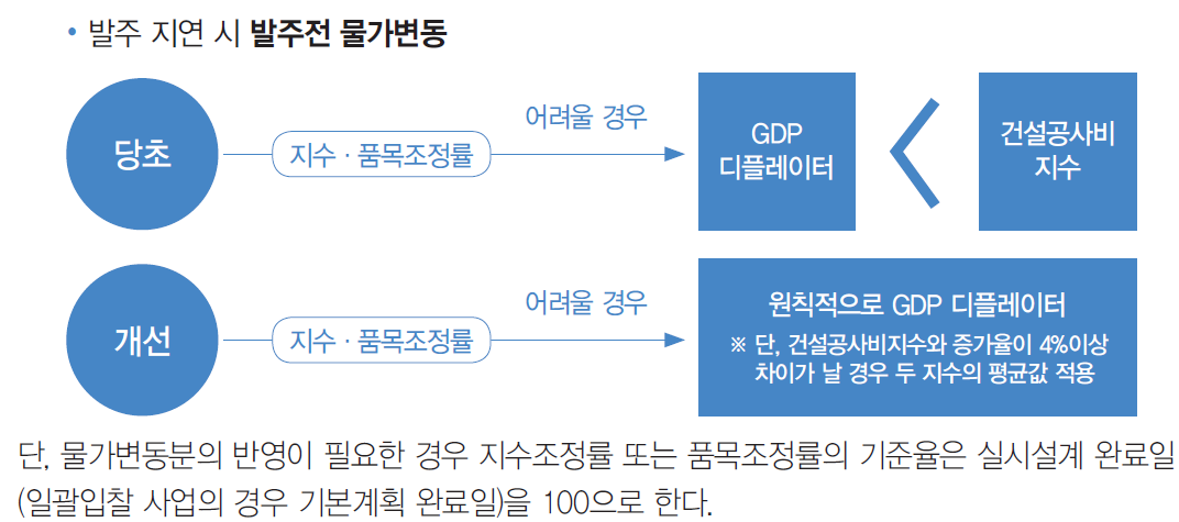 1. [제98조(자율조정 적용단계)] 발주 전 자율조정 시 건설투자 GDP 디플레이터와 건설공사비 지수 중 상승률이 낮은 것을 적용하는 것을 건설투자 GDP 디플레이터로 일원화하고, 두 지수의 변동률 차이가 4% p 이상인 경우에는 두 지수 변동률 평균값을 적용하도록 하는 한편 일괄입찰사업의 물가반영을 위해 기산일을 명확하게 하였음.