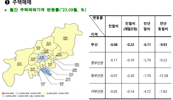 - 부산지역 전체 매매, 전/월세 가격 모두 하락세 지속되는 가운데 2분기 대비 하락폭 점차 축소