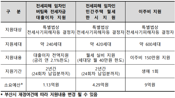 - 사업문의 : 부산시 주택정책과(051-888-4251~4258), 부산시전세피해지원센터(051-888-5101)