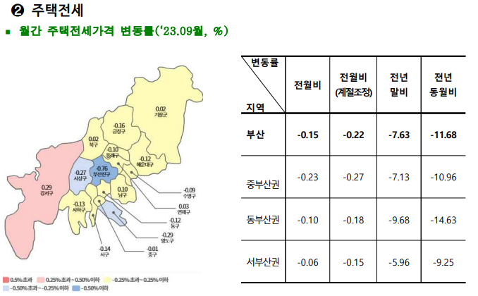 - 부산지역 전체 매매, 전/월세 가격 모두 하락세 지속되는 가운데 2분기 대비 하락폭 점차 축소