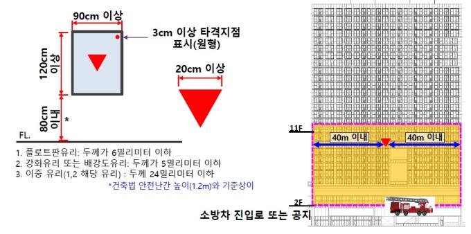 | 건축물의 피난·방화구조 등의 기준에 관한 규칙 제18조의2(소방관 진입창의 기준) 법 제49조제3항에서 “국토교통부령으로 정하는 기준”이란 다음 각 호의 요건을 모두 충족하는 것을 말한다. 1. 2층 이상 11층 이하인 층에 각각 1개소 이상 설치할 것. 이 경우 소방관이 진입할 수 있는 창의 가운데에서 벽면 끝까지의 수평 거리가 40미터 이상인 경우에는 40미터 이내마다 소방관이 진입할 수 있는 창을 추가로 설치해야 한다. 2. 소방차 진입로 또는 소방차 진입이 가능한 공터에 면할 것 3. 창문의 가운데에 지름 20센티미터 이상의 역삼각형을 야간에도 알아볼 수 있도록 빛 반사 등으로 붉은색으로 표시할 것 4. 창문의 한쪽 모서리에 타격지점을 지름 3센티미터 이상의 원형으로 표시할 것 5. 창문의 크기는 폭 90센티미터 이상, 높이 1.2미터 이상으로 하고, 실내 바닥면으로부터 창의 아랫부분까지의 높이는 80센티미터 이내로 할 것 6. 다음 각 목의 어느 하나에 해당하는 유리를 사용할 것 가. 플로트판유리로서 그 두께가 6밀리미터 이하인 것 나. 강화유리 또는 배강도유리로서 그 두께가 5밀리미터 이하인 것 다. 가목 또는 나목에 해당하는 유리로 구성된 이중 유리로서 그 두께가 24밀리미터 이하인 것 |