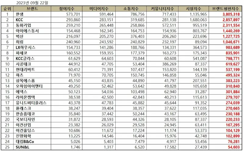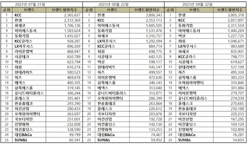 2023년 9월 인테리어 업체(실내건축업) 브랜드 선호도 평판 순위는 1위 한샘, 2위 KCC, 3위 동화기업 순입니다. 인테리어 업체 선정 시 참고하시면 좋겠습니다.