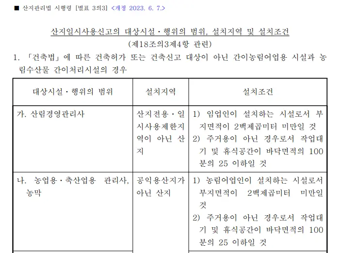 '산지관리법' 보면 건축허가 대상이 아니라 가설건축물 형태의 간이처리시설로서 설치하도록 규정하고 있는데 모든 답은 사실 이 법 안 안에 있다는 것으로 알 수 있으니 하나하나 살펴보도록 하자.