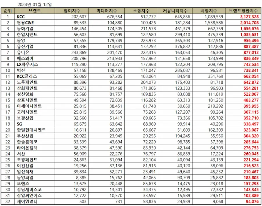 2024년 1월 건축자재 상장기업 중 브랜드 선호도 선호도 분석결과 1위 KCC, 2위 쌍용 C&E, 3위 동화기업 순으로 빅데이터 결과 분석되었다. 건축공사 시 브랜드 선호도를 알고 있으면 자재 선택에 도움이 되므로 참고하길 바란다.