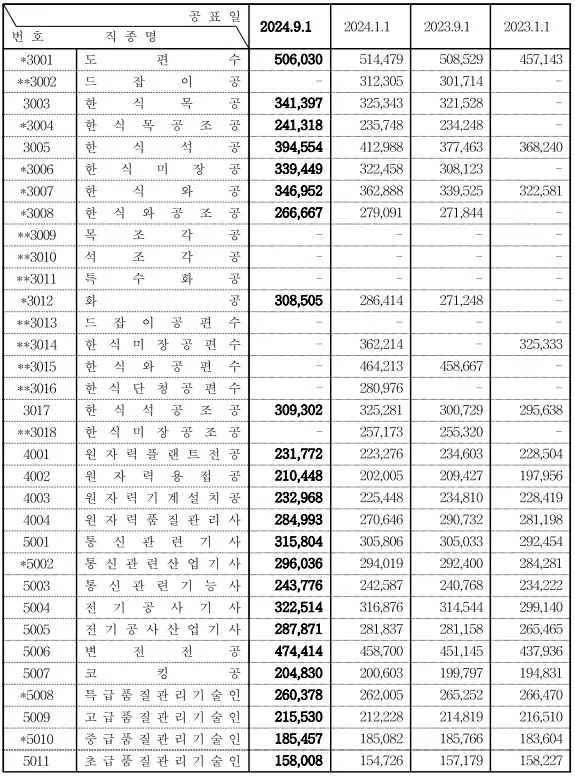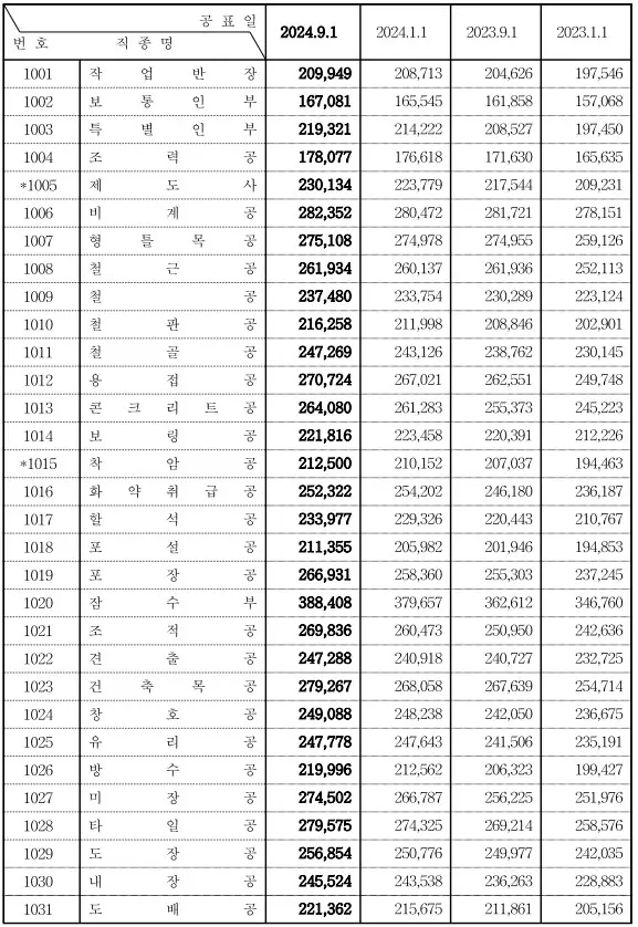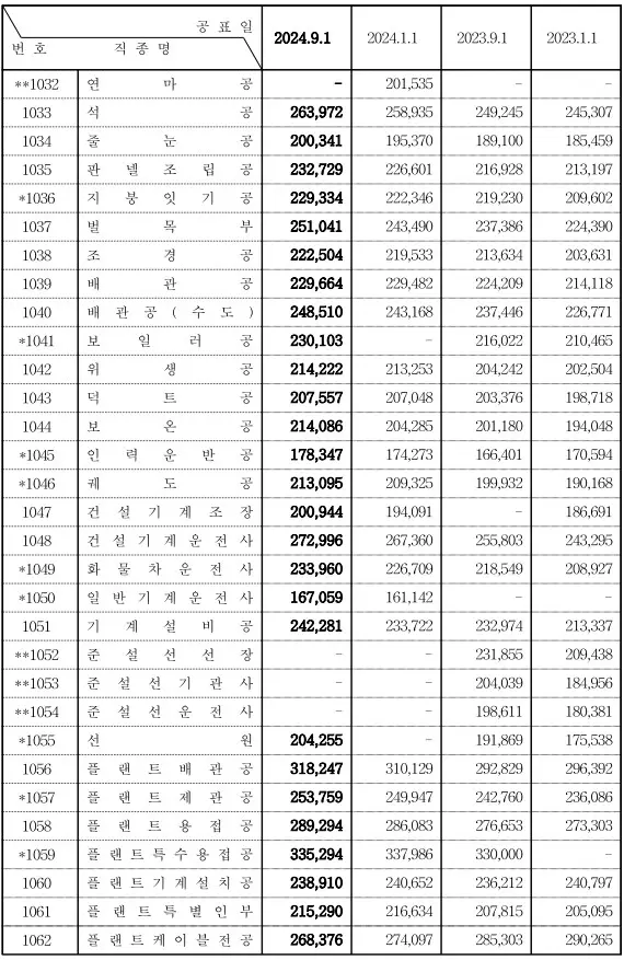 대한건설협회의 2024년 9월 1일부터 적용되는 상반기 노임단가가 발표되었다. 2024년 상반기 전체직종 평균 노임이 270,789원이었는데 하반기는 274,286원으로 약 1.3% 상승하였다. 공공건축물 발주 시 아래 노임단가를 참고하길 바란다.