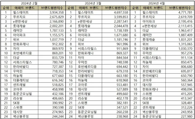 <2024년 2~4월 아파트 브랜드 순위>