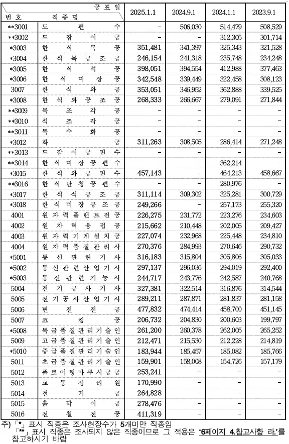 - 노임은 전국의 2천개 건설현장을 대상으로 우편조사, 인터넷 조사 등을 통해 작성하며, 직종별 임금 = 직종별 조사된 총 임금 / 직종별 조사된 총인원으로 구한다. 금전은 조사 기준기간이 2024.9.1.~9.30.이다.